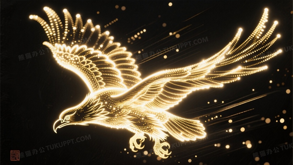 本作品内容为画面左上角是一只由发光流动粒子组成的雄鹰, 格式为 jpg, 大小1 MB, 图片尺寸为1664 x 936, 作品中背景图片无需修改, 源文件无水印,可以直接使用, 欢迎使用熊猫办公。 如认为平台内容涉嫌侵权,可通过邮件:tousu@tukuppt.com提出书面通知,我们将及时处理。