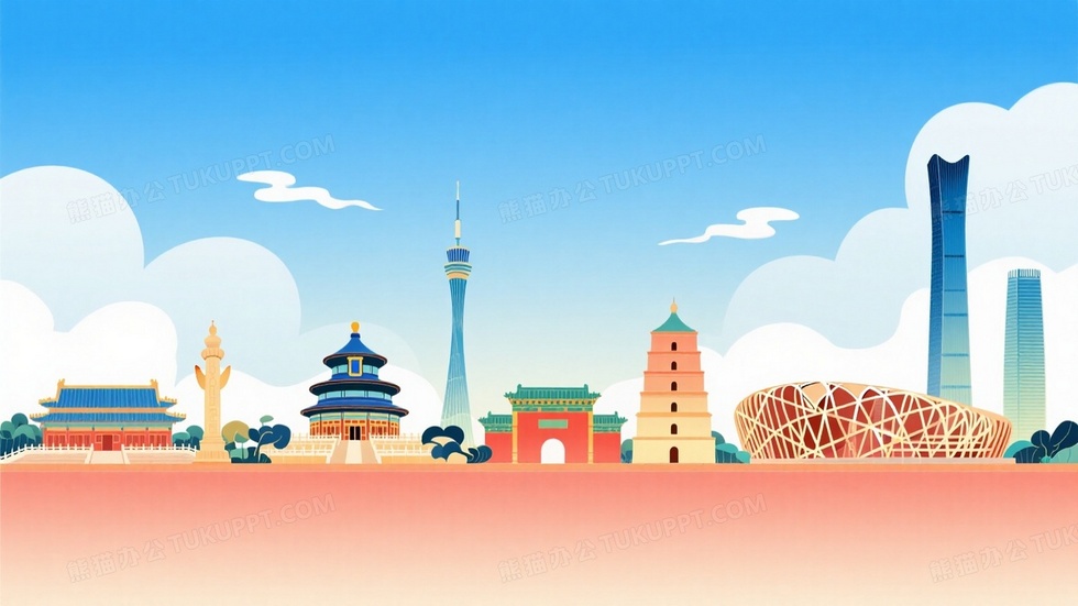 本作品内容为北京地标插画所有元素在一排出现在画面靠下, 格式为 jpg, 大小1 MB, 图片尺寸为1664 x 936, 作品中背景图片无需修改, 源文件无水印,可以直接使用, 欢迎使用熊猫办公。 如认为平台内容涉嫌侵权,可通过邮件:tousu@tukuppt.com提出书面通知,我们将及时处理。