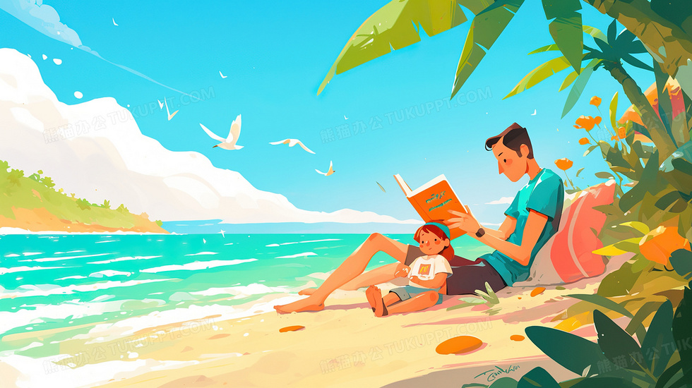 本作品内容为海边亲子阅读插画, 格式为 jpg, 大小3 MB, 图片尺寸为2912 x 1632, 源文件无水印, 欢迎使用熊猫办公。 如认为平台内容涉嫌侵权,可通过邮件:tousu@tukuppt.com提出书面通知,我们将及时处理。