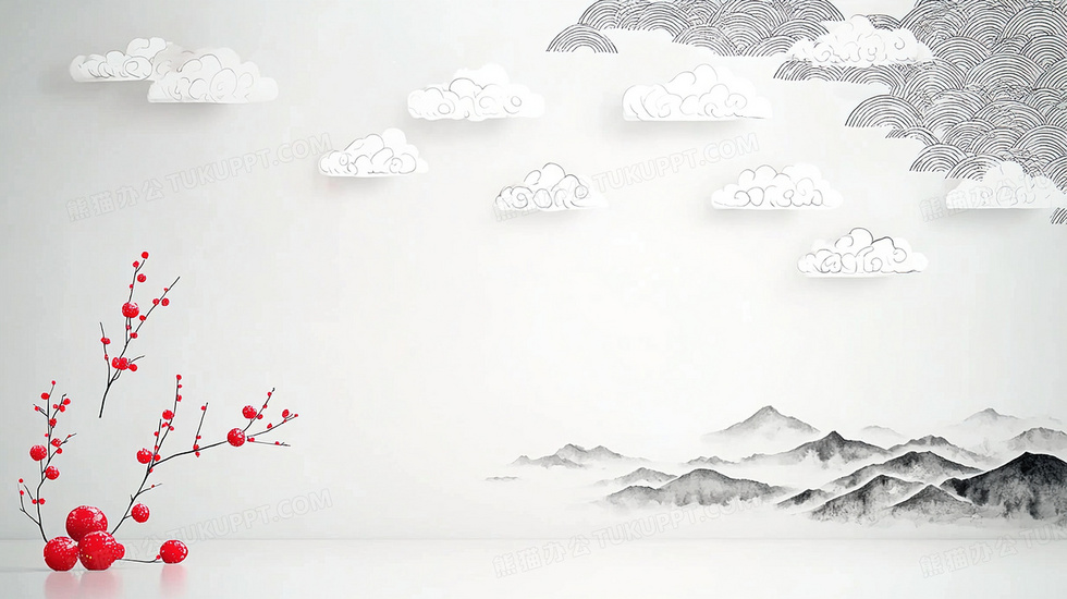 本作品内容为云层下水墨山水红色果实背景, 格式为 jpg, 大小2 MB, 图片尺寸为2912 x 1632, 作品中背景图片无需修改, 源文件无水印,可以直接使用, 欢迎使用熊猫办公。 如认为平台内容涉嫌侵权,可通过邮件:tousu@tukuppt.com提出书面通知,我们将及时处理。