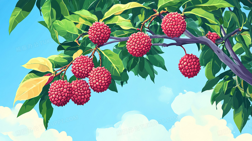 本作品内容为荔枝树上的荔枝特写插画, 格式为 jpg, 大小3 MB, 图片尺寸为2912 x 1632, 源文件无水印, 欢迎使用熊猫办公。 如认为平台内容涉嫌侵权,可通过邮件:tousu@tukuppt.com提出书面通知,我们将及时处理。
