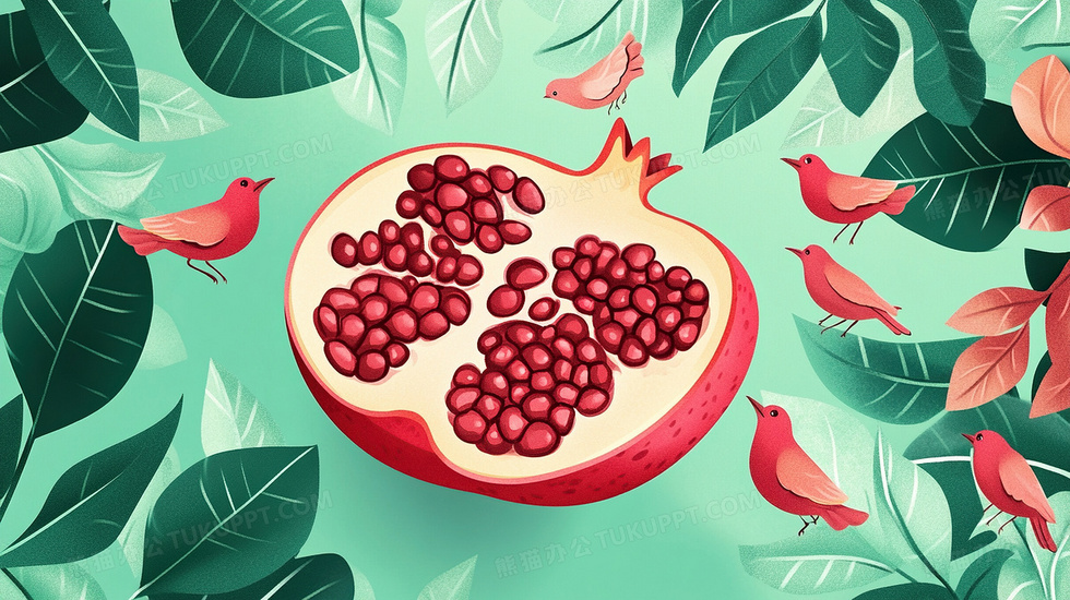 本作品内容为红石榴诱人新鲜水果插画, 格式为 jpg, 大小4 MB, 图片尺寸为2912 x 1632, 源文件无水印, 欢迎使用熊猫办公。 如认为平台内容涉嫌侵权,可通过邮件:tousu@tukuppt.com提出书面通知,我们将及时处理。