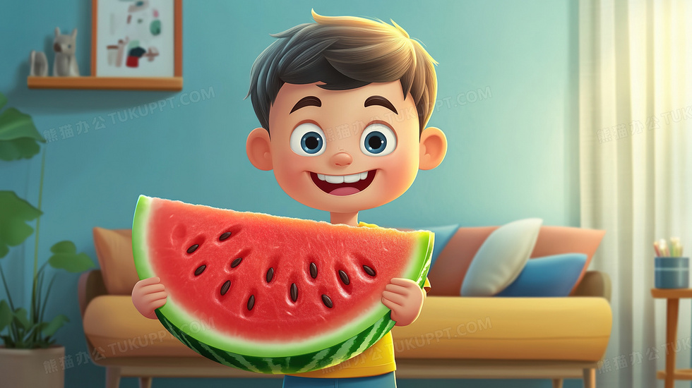 本作品内容为客厅内抱着西瓜的卡通男孩插画, 格式为 jpg, 大小2 MB, 图片尺寸为2912 x 1632, 源文件无水印, 欢迎使用熊猫办公。 如认为平台内容涉嫌侵权,可通过邮件:tousu@tukuppt.com提出书面通知,我们将及时处理。