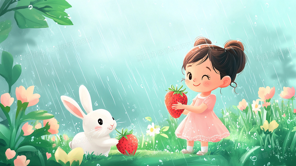 本作品内容为春雨时节早地上小朋友给小兔子吃草莓的卡通插画, 格式为 jpg, 大小3 MB, 图片尺寸为2912 x 1632, 源文件无水印, 欢迎使用熊猫办公。 如认为平台内容涉嫌侵权,可通过邮件:tousu@tukuppt.com提出书面通知,我们将及时处理。