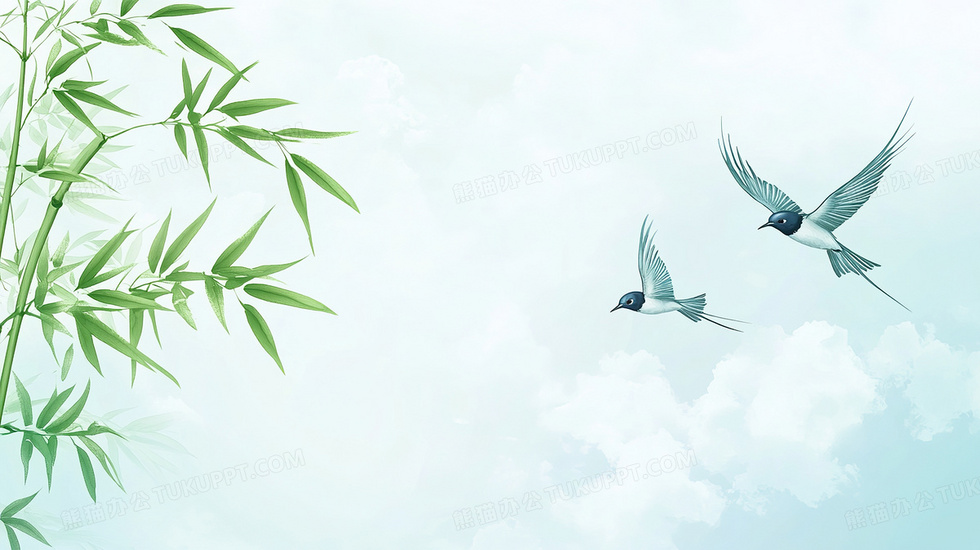 本作品内容为中国风竹叶鸟儿背景, 格式为 jpg, 大小2 MB, 图片尺寸为2912 x 1632, 作品中背景图片无需修改, 源文件无水印,可以直接使用, 欢迎使用熊猫办公。 如认为平台内容涉嫌侵权,可通过邮件:tousu@tukuppt.com提出书面通知,我们将及时处理。