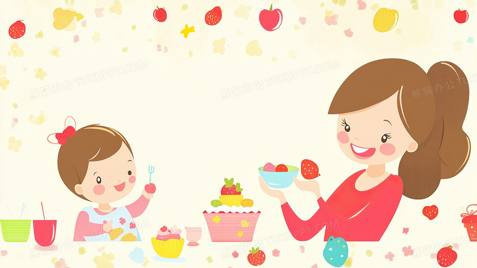 本作品内容为卡通风妈妈陪孩子吃水果背景, 格式为 jpg, 大小2 MB, 图片尺寸为2912 x 1632, 作品中背景图片无需修改, 源文件无水印,可以直接使用, 欢迎使用熊猫办公。 如认为平台内容涉嫌侵权,可通过邮件:tousu@tukuppt.com提出书面通知,我们将及时处理。