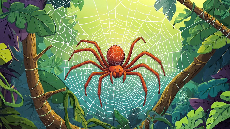 本作品内容为卡通插画风格森林里蜘蛛网上结网的蜘蛛插画, 格式为 jpg, 大小4 MB, 图片尺寸为2912 x 1632, 源文件无水印, 欢迎使用熊猫办公。 如认为平台内容涉嫌侵权,可通过邮件:tousu@tukuppt.com提出书面通知,我们将及时处理。