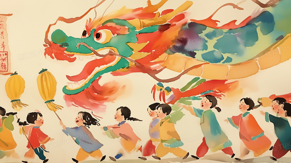 本作品内容为孩子们在参与热闹的舞龙表演插画, 格式为 jpg, 大小6 MB, 图片尺寸为2912 x 1632, 源文件无水印, 欢迎使用熊猫办公。 如认为平台内容涉嫌侵权,可通过邮件:tousu@tukuppt.com提出书面通知,我们将及时处理。