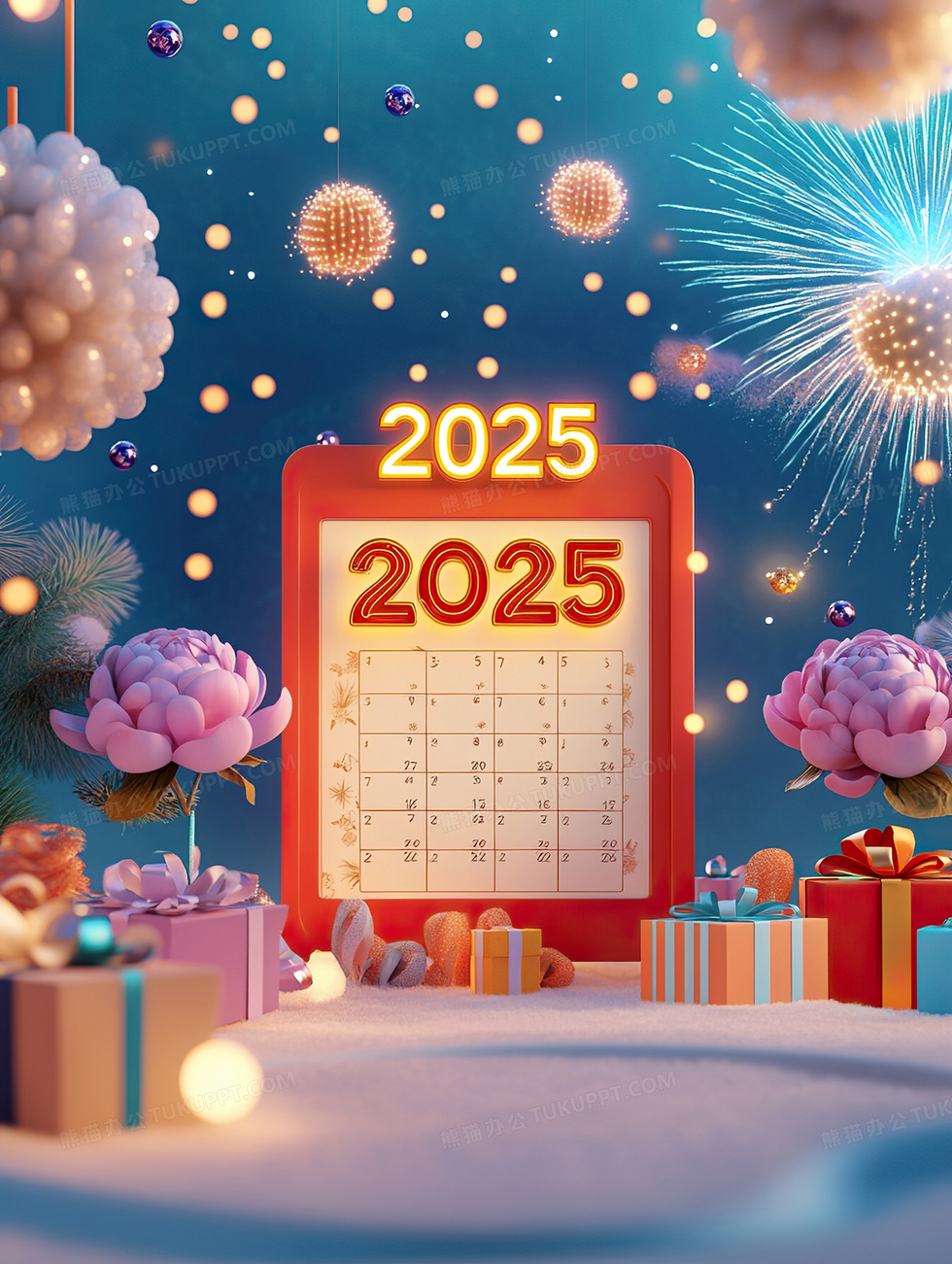 本作品内容为2025新年元旦台历插画, 格式为 jpg, 大小3 MB, 图片尺寸为1856 x 2464, 源文件无水印, 欢迎使用熊猫办公。 如认为平台内容涉嫌侵权,可通过邮件:tousu@tukuppt.com提出书面通知,我们将及时处理。