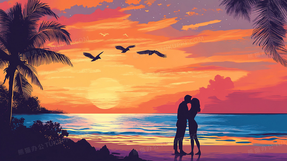 本作品内容为剪影风日出日落海边亲吻的情侣插画, 格式为 jpg, 大小3 MB, 图片尺寸为2912 x 1632, 源文件无水印, 欢迎使用熊猫办公。 如认为平台内容涉嫌侵权,可通过邮件:tousu@tukuppt.com提出书面通知,我们将及时处理。