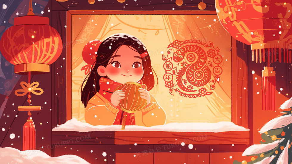 本作品内容为女孩手举灯笼在窗边欣赏窗花剪纸插画, 格式为 jpg, 大小5 MB, 图片尺寸为2912 x 1632, 源文件无水印, 欢迎使用熊猫办公。 如认为平台内容涉嫌侵权,可通过邮件:tousu@tukuppt.com提出书面通知,我们将及时处理。