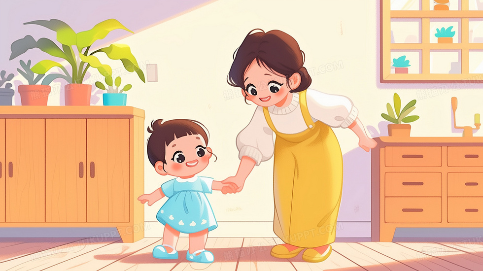 本作品内容为妈妈牵着男婴的手练习蹒跚走路插画, 格式为 jpg, 大小4 MB, 图片尺寸为2912 x 1632, 源文件无水印, 欢迎使用熊猫办公。 如认为平台内容涉嫌侵权,可通过邮件:tousu@tukuppt.com提出书面通知,我们将及时处理。