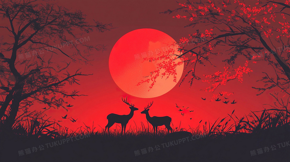 本作品内容为森林麋鹿剪影风景唯美插画, 格式为 jpg, 大小3 MB, 图片尺寸为2912 x 1632, 源文件无水印, 欢迎使用熊猫办公。 如认为平台内容涉嫌侵权,可通过邮件:tousu@tukuppt.com提出书面通知,我们将及时处理。