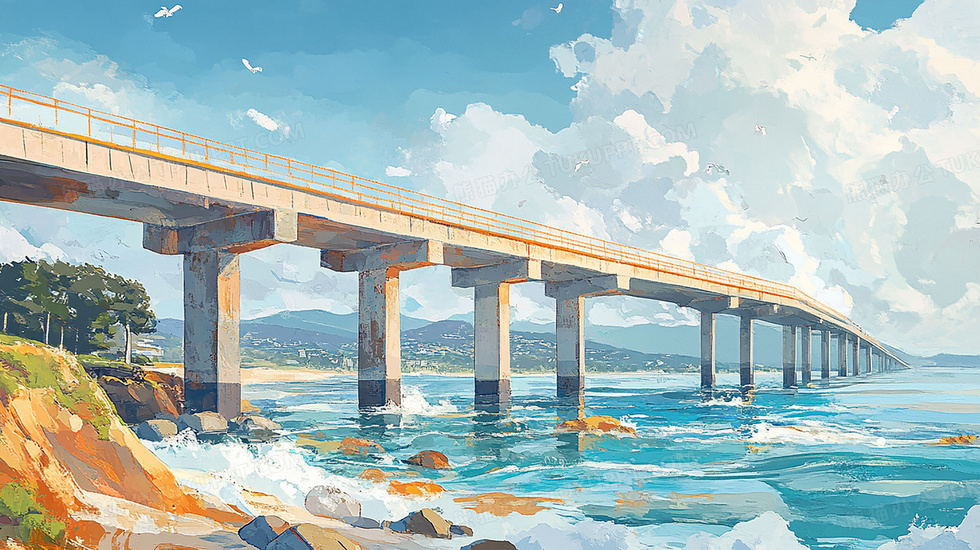 本作品内容为跨海大桥海边风景插画, 格式为 jpg, 大小1 MB, 图片尺寸为2912 x 1632, 源文件无水印, 欢迎使用熊猫办公。 如认为平台内容涉嫌侵权,可通过邮件:tousu@tukuppt.com提出书面通知,我们将及时处理。