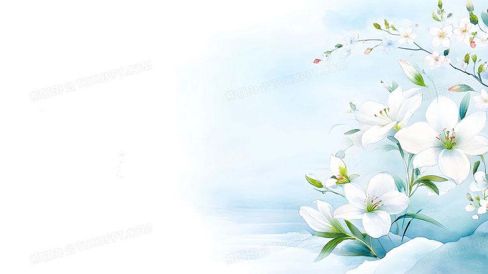 本作品内容为简约清新水彩国风植物白玉兰花背景, 格式为 jpg, 大小1 MB, 图片尺寸为2912 x 1632, 作品中背景图片无需修改, 源文件无水印,可以直接使用, 欢迎使用熊猫办公。 如认为平台内容涉嫌侵权,可通过邮件:tousu@tukuppt.com提出书面通知,我们将及时处理。