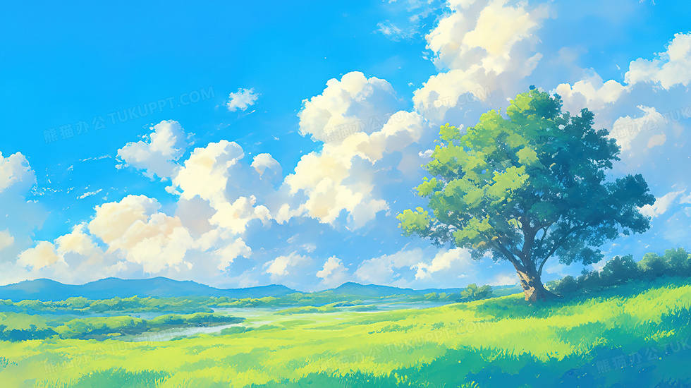 本作品内容为春天草地蓝天白云大自然风景插画, 格式为 jpg, 大小4 MB, 图片尺寸为2912 x 1632, 源文件无水印, 欢迎使用熊猫办公。 如认为平台内容涉嫌侵权,可通过邮件:tousu@tukuppt.com提出书面通知,我们将及时处理。