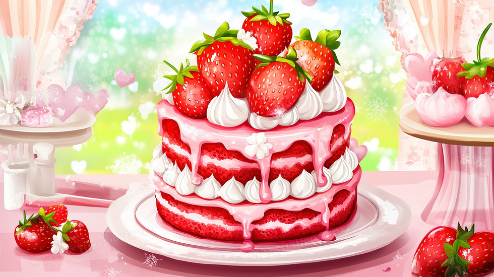 本作品内容为祝贺生日节日草莓蛋糕插画, 格式为 jpg, 大小3 MB, 图片尺寸为2912 x 1632, 源文件无水印, 欢迎使用熊猫办公。 如认为平台内容涉嫌侵权,可通过邮件:tousu@tukuppt.com提出书面通知,我们将及时处理。