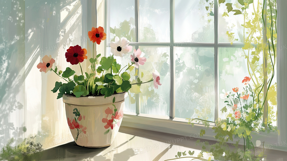 本作品内容为家居装饰室内窗户旁摆放的花盆插画, 格式为 jpg, 大小3 MB, 图片尺寸为2912 x 1632, 源文件无水印, 欢迎使用熊猫办公。 如认为平台内容涉嫌侵权,可通过邮件:tousu@tukuppt.com提出书面通知,我们将及时处理。