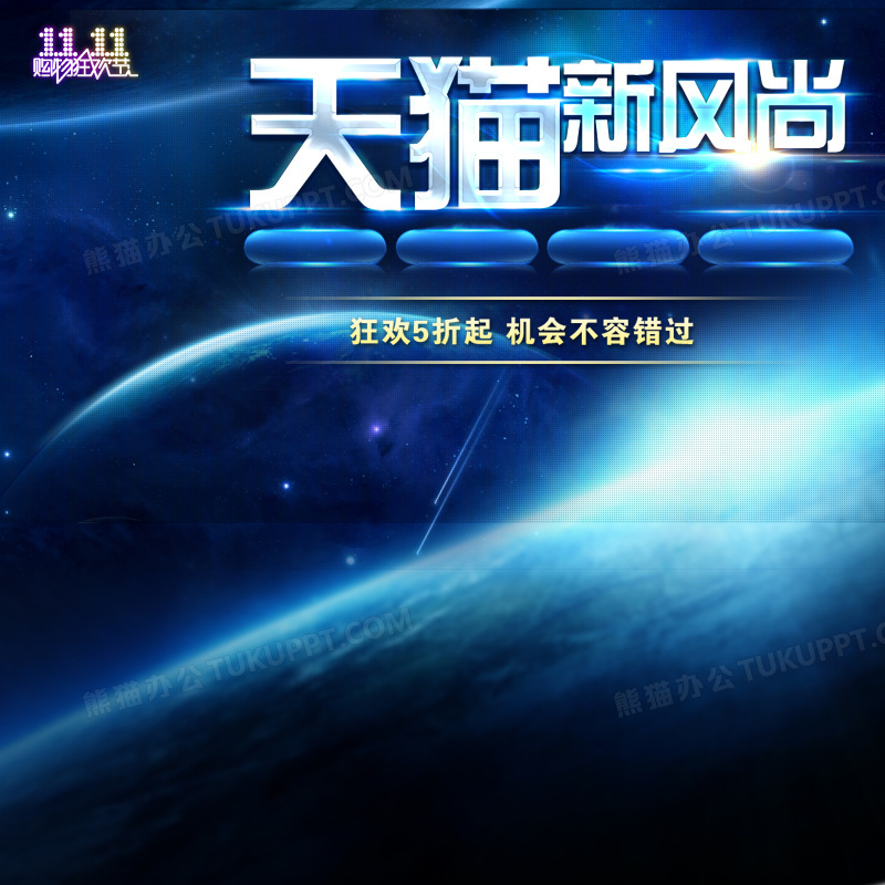 本作品内容为天猫双十一蓝色宇宙主图, 格式为 psd, 图片尺寸为800 x 800, 作品中背景图片无需修改, 源文件无水印,可以直接使用, 欢迎使用熊猫办公。 如认为平台内容涉嫌侵权,可通过邮件:tousu@tukuppt.com提出书面通知,我们将及时处理。