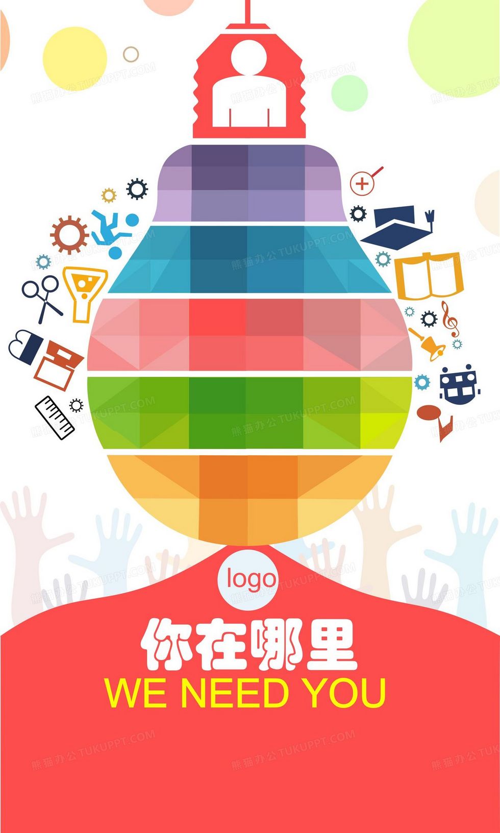 本作品内容为彩色灯泡招聘广告背景, 格式为 cdr, 图片尺寸为1877 x 3125, 作品中背景图片无需修改, 源文件无水印,可以直接使用, 欢迎使用熊猫办公。 如认为平台内容涉嫌侵权,可通过邮件:tousu@tukuppt.com提出书面通知,我们将及时处理。