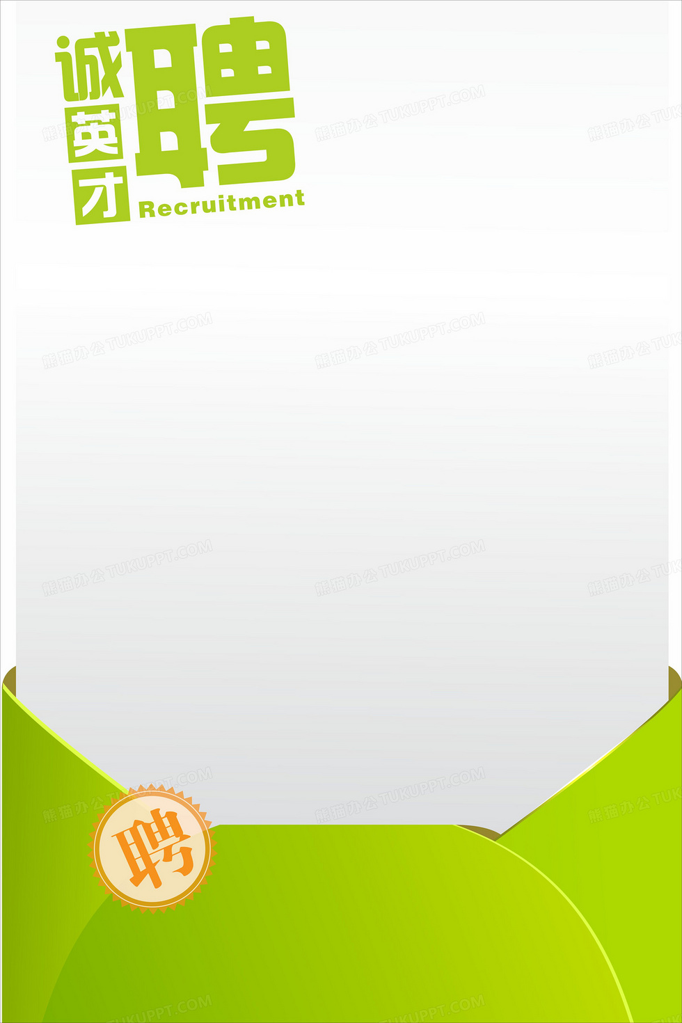 本作品内容为绿色清新信封招聘广告, 格式为 cdr, 图片尺寸为3544 x 5315, 作品中背景图片无需修改, 源文件无水印,可以直接使用, 欢迎使用熊猫办公。 如认为平台内容涉嫌侵权,可通过邮件:tousu@tukuppt.com提出书面通知,我们将及时处理。