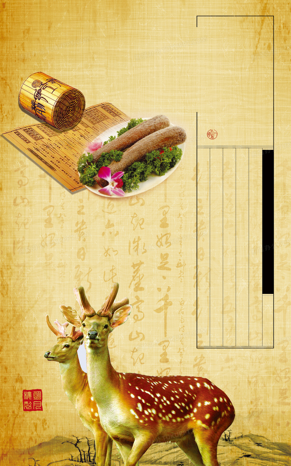 本作品内容为鹿中药中医中国风背景, 格式为 psd, 图片尺寸为2953 x 4725, 作品中背景图片无需修改, 源文件无水印,可以直接使用, 欢迎使用熊猫办公。 如认为平台内容涉嫌侵权,可通过邮件:tousu@tukuppt.com提出书面通知,我们将及时处理。