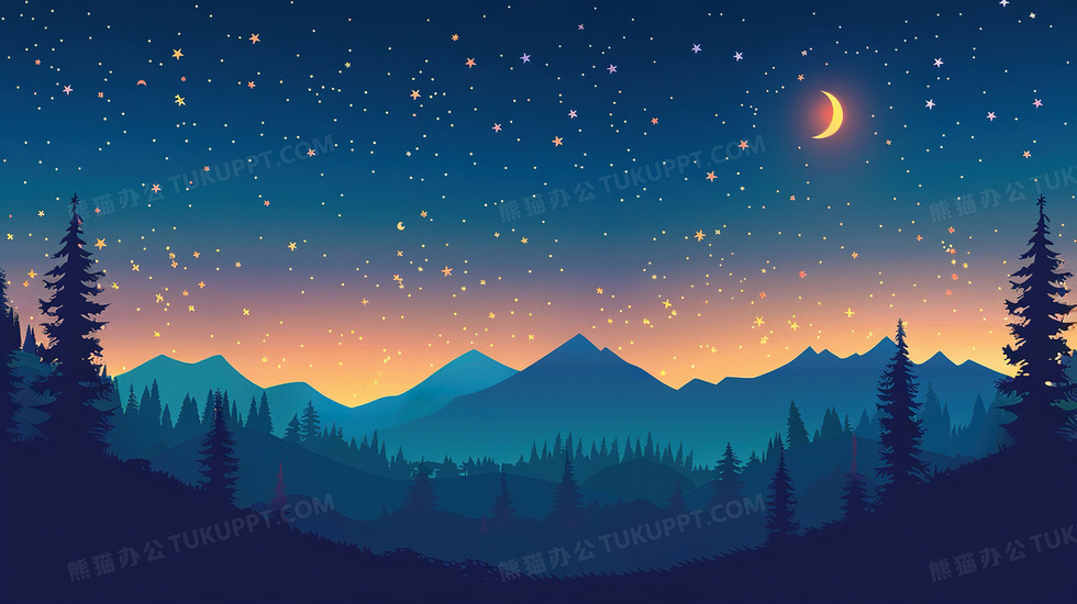 本作品内容为梦幻森林星空风景背景, 格式为 jpg, 大小3 MB, 图片尺寸为2912 x 1632, 作品中背景图片无需修改, 源文件无水印,可以直接使用, 欢迎使用熊猫办公。 如认为平台内容涉嫌侵权,可通过邮件:tousu@tukuppt.com提出书面通知,我们将及时处理。