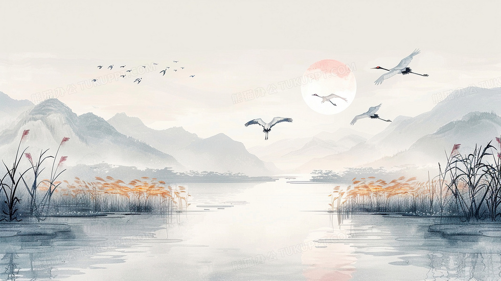 本作品内容为芦苇中国风山水水墨风景背景, 格式为 jpg, 大小3 MB, 图片尺寸为2912 x 1632, 作品中背景图片无需修改, 源文件无水印,可以直接使用, 欢迎使用熊猫办公。 如认为平台内容涉嫌侵权,可通过邮件:tousu@tukuppt.com提出书面通知,我们将及时处理。