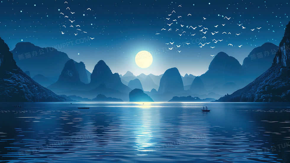 本作品内容为湖面山水月亮渔船背景, 格式为 jpg, 大小5 MB, 图片尺寸为2912 x 1632, 作品中背景图片无需修改, 源文件无水印,可以直接使用, 欢迎使用熊猫办公。 如认为平台内容涉嫌侵权,可通过邮件:tousu@tukuppt.com提出书面通知,我们将及时处理。