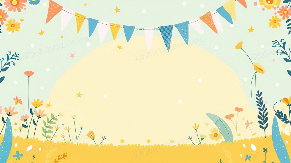 本作品内容为黄色彩旗卡通边框简约背景, 格式为 jpg, 大小2 MB, 图片尺寸为2912 x 1632, 作品中背景图片无需修改, 源文件无水印,可以直接使用, 欢迎使用熊猫办公。 如认为平台内容涉嫌侵权,可通过邮件:tousu@tukuppt.com提出书面通知,我们将及时处理。