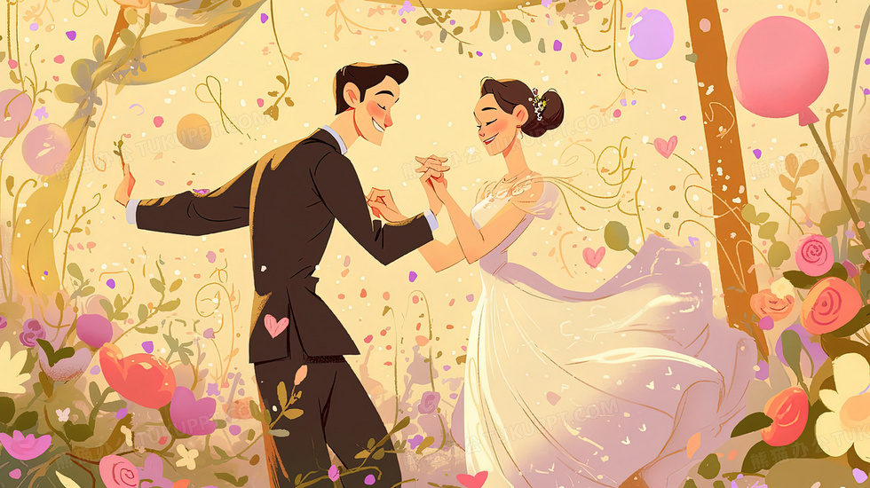 本作品内容为浪漫婚礼气球跳舞的新婚夫妻插画, 格式为 jpg, 大小3 MB, 图片尺寸为2912 x 1632, 源文件无水印, 欢迎使用熊猫办公。 如认为平台内容涉嫌侵权,可通过邮件:tousu@tukuppt.com提出书面通知,我们将及时处理。