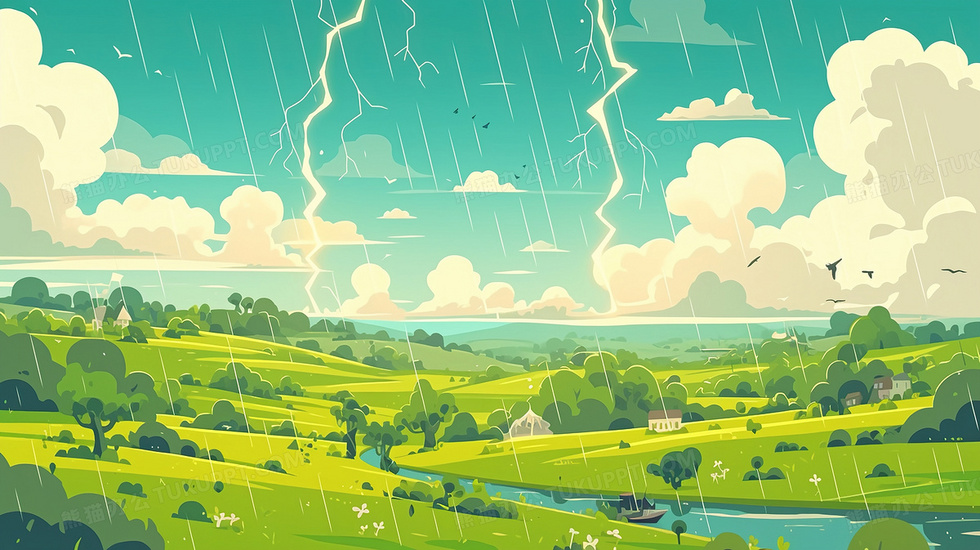本作品内容为农村暴雨电闪雷鸣自然灾害场景插画, 格式为 jpg, 大小3 MB, 图片尺寸为2912 x 1632, 源文件无水印, 欢迎使用熊猫办公。 如认为平台内容涉嫌侵权,可通过邮件:tousu@tukuppt.com提出书面通知,我们将及时处理。
