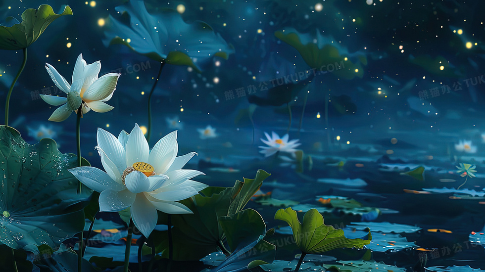 本作品内容为唯美夏夜萤火虫荷花池插画, 格式为 jpg, 大小3 MB, 图片尺寸为2912 x 1632, 源文件无水印, 欢迎使用熊猫办公。 如认为平台内容涉嫌侵权,可通过邮件:tousu@tukuppt.com提出书面通知,我们将及时处理。