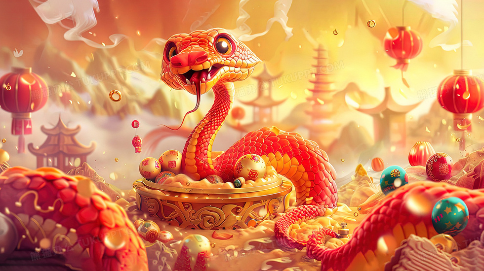 本作品内容为蛇年宝箱金币上爬行的蛇创意插画, 格式为 jpg, 大小3 MB, 图片尺寸为2912 x 1632, 源文件无水印, 欢迎使用熊猫办公。 如认为平台内容涉嫌侵权,可通过邮件:tousu@tukuppt.com提出书面通知,我们将及时处理。