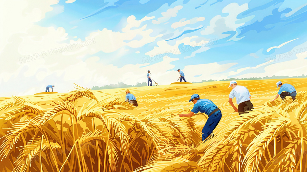 本作品内容为田野丰收劳动的农民插画, 格式为 jpg, 大小3 MB, 图片尺寸为2912 x 1632, 源文件无水印, 欢迎使用熊猫办公。 如认为平台内容涉嫌侵权,可通过邮件:tousu@tukuppt.com提出书面通知,我们将及时处理。