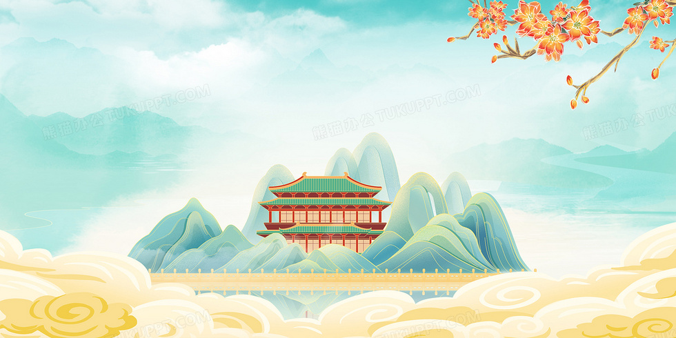 本作品内容为中国风古建筑山水古风背景, 格式为 psd, 大小45 MB, 图片尺寸为4724 x 2362, 作品中背景图片无需修改, 源文件无水印,可以直接使用, 欢迎使用熊猫办公。 如认为平台内容涉嫌侵权,可通过邮件:tousu@tukuppt.com提出书面通知,我们将及时处理。