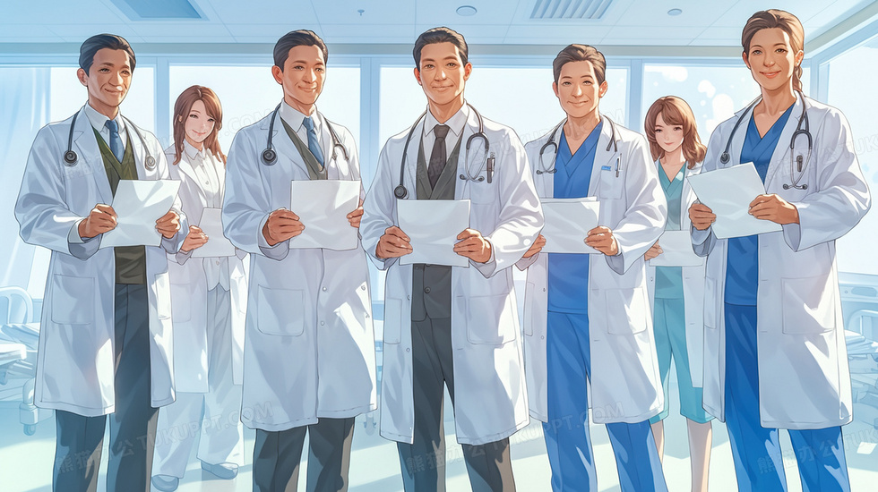 本作品内容为身穿白大褂听诊器的医生团队特写插画, 格式为 jpg, 大小3 MB, 图片尺寸为2912 x 1632, 源文件无水印, 欢迎使用熊猫办公。 如认为平台内容涉嫌侵权,可通过邮件:tousu@tukuppt.com提出书面通知,我们将及时处理。