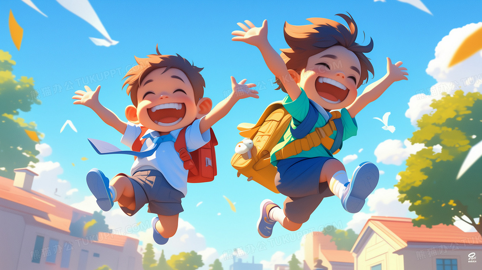 本作品内容为幼儿园放学的孩子开心跳跃欢呼插画, 格式为 jpg, 大小6 MB, 图片尺寸为2912 x 1632, 源文件无水印, 欢迎使用熊猫办公。 如认为平台内容涉嫌侵权,可通过邮件:tousu@tukuppt.com提出书面通知,我们将及时处理。