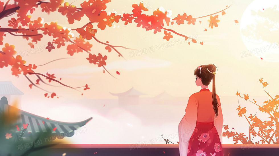 本作品内容为花树下的古风女子背影插画, 格式为 jpg, 大小2 MB, 图片尺寸为2912 x 1632, 源文件无水印, 欢迎使用熊猫办公。 如认为平台内容涉嫌侵权,可通过邮件:tousu@tukuppt.com提出书面通知,我们将及时处理。