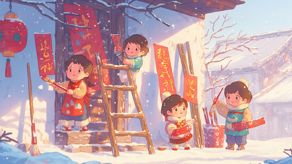 本作品内容为新年门口贴对联的孩子们插画, 格式为 jpg, 大小3 MB, 图片尺寸为2912 x 1632, 源文件无水印, 欢迎使用熊猫办公。 如认为平台内容涉嫌侵权,可通过邮件:tousu@tukuppt.com提出书面通知,我们将及时处理。