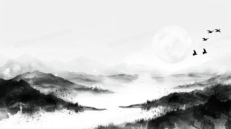 本作品内容为山水中国风水墨简约背景, 格式为 jpg, 大小3 MB, 图片尺寸为2912 x 1632, 作品中背景图片无需修改, 源文件无水印,可以直接使用, 欢迎使用熊猫办公。 如认为平台内容涉嫌侵权,可通过邮件:tousu@tukuppt.com提出书面通知,我们将及时处理。
