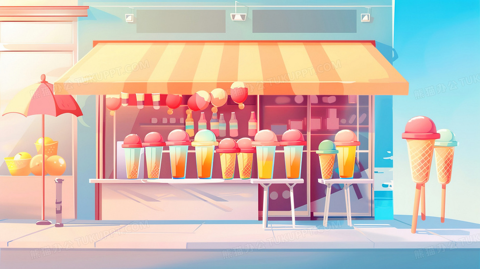 本作品内容为炎热夏季美食冰激凌店铺插画, 格式为 jpg, 大小2 MB, 图片尺寸为2912 x 1632, 源文件无水印, 欢迎使用熊猫办公。 如认为平台内容涉嫌侵权,可通过邮件:tousu@tukuppt.com提出书面通知,我们将及时处理。