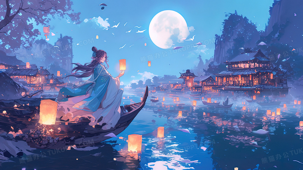 本作品内容为夜晚坐木船上放河灯的少女插画, 格式为 jpg, 大小3 MB, 图片尺寸为2912 x 1632, 源文件无水印, 欢迎使用熊猫办公。 如认为平台内容涉嫌侵权,可通过邮件:tousu@tukuppt.com提出书面通知,我们将及时处理。