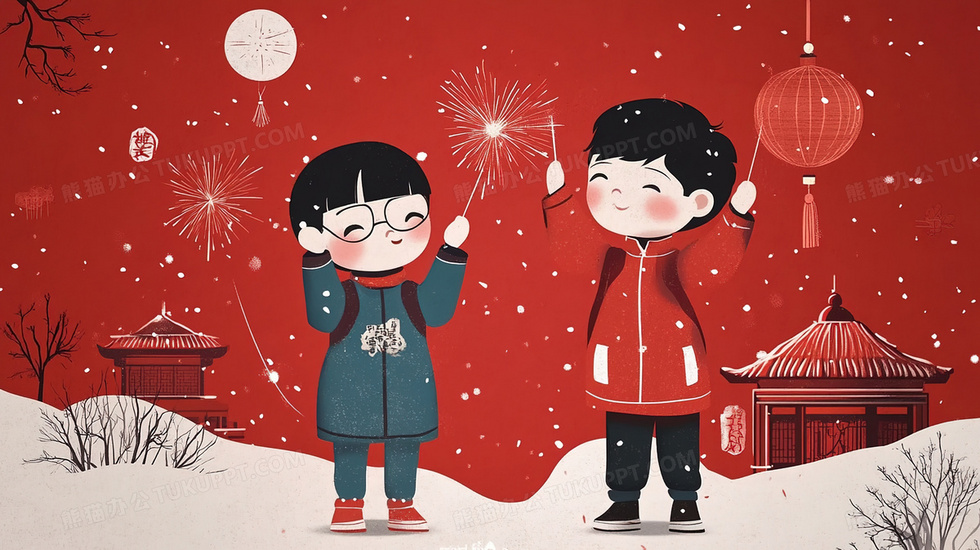 本作品内容为红色喜庆新年小孩玩仙女棒插画, 格式为 jpg, 大小3 MB, 图片尺寸为2912 x 1632, 源文件无水印, 欢迎使用熊猫办公。 如认为平台内容涉嫌侵权,可通过邮件:tousu@tukuppt.com提出书面通知,我们将及时处理。