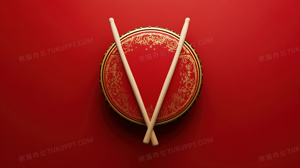 本作品内容为中国红高端色调鼓与鼓槌, 格式为 jpg, 大小2 MB, 图片尺寸为2912 x 1632, 作品中背景图片无需修改, 源文件无水印,可以直接使用, 欢迎使用熊猫办公。 如认为平台内容涉嫌侵权,可通过邮件:tousu@tukuppt.com提出书面通知,我们将及时处理。