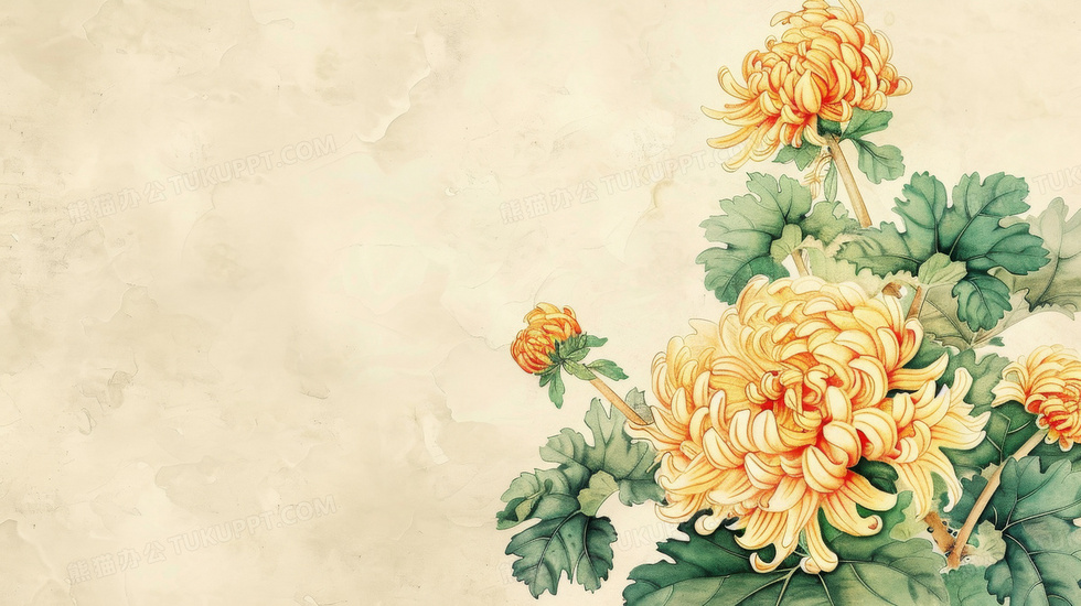 本作品内容为中国风菊花四君子国画背景, 格式为 jpg, 大小9 MB, 图片尺寸为2912 x 1632, 作品中背景图片无需修改, 源文件无水印,可以直接使用, 欢迎使用熊猫办公。 如认为平台内容涉嫌侵权,可通过邮件:tousu@tukuppt.com提出书面通知,我们将及时处理。