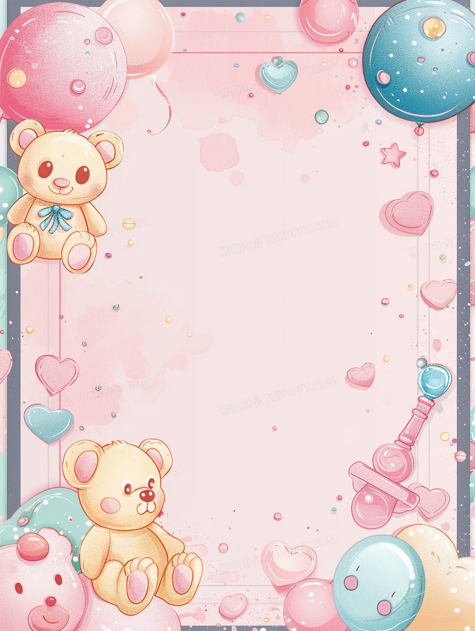 本作品内容为粉色卡通梦幻小熊母婴边框背景, 格式为 jpg, 大小3 MB, 图片尺寸为1856 x 2464, 作品中背景图片无需修改, 源文件无水印,可以直接使用, 欢迎使用熊猫办公。 如认为平台内容涉嫌侵权,可通过邮件:tousu@tukuppt.com提出书面通知,我们将及时处理。