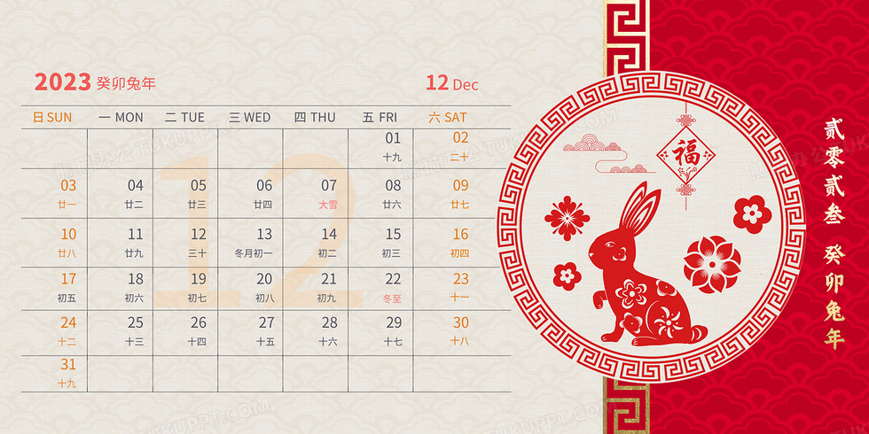 本作品内容为红色烫金兔年十二月日历装饰素材, 格式为 psd, 大小54 MB, 图片尺寸为4724 x 2362, 作品中背景图片无需修改, 源文件无水印,可以直接使用, 欢迎使用熊猫办公。 如认为平台内容涉嫌侵权,可通过邮件:tousu@tukuppt.com提出书面通知,我们将及时处理。