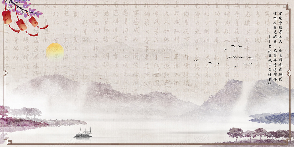 本作品内容为新年诗词底纹水墨山水中国风背景, 格式为 psd, 大小94 MB, 图片尺寸为4724 x 2362, 作品中背景图片无需修改, 源文件无水印,可以直接使用, 欢迎使用熊猫办公。 如认为平台内容涉嫌侵权,可通过邮件:tousu@tukuppt.com提出书面通知,我们将及时处理。