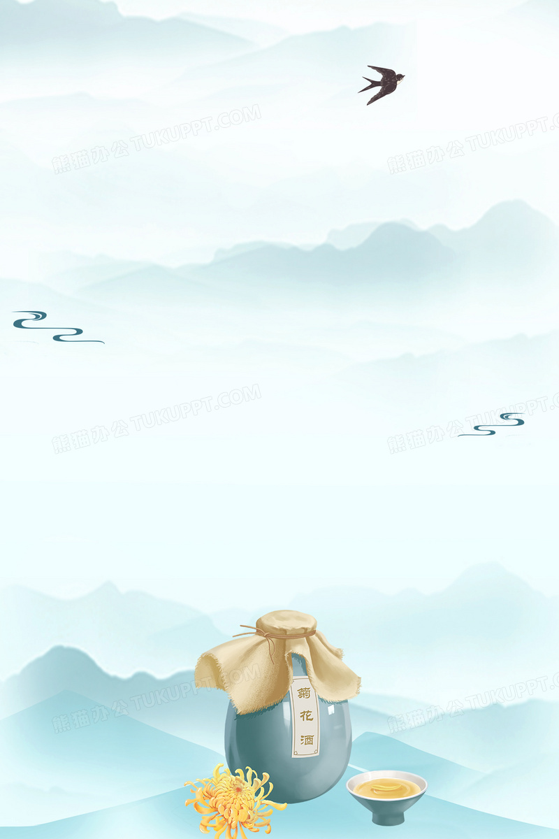 本作品内容为中国风复古山水菊花酒背景, 格式为 psd, 大小22 MB, 图片尺寸为1181 x 1772, 作品中背景图片无需修改, 源文件无水印,可以直接使用, 欢迎使用熊猫办公。 如认为平台内容涉嫌侵权,可通过邮件:tousu@tukuppt.com提出书面通知,我们将及时处理。